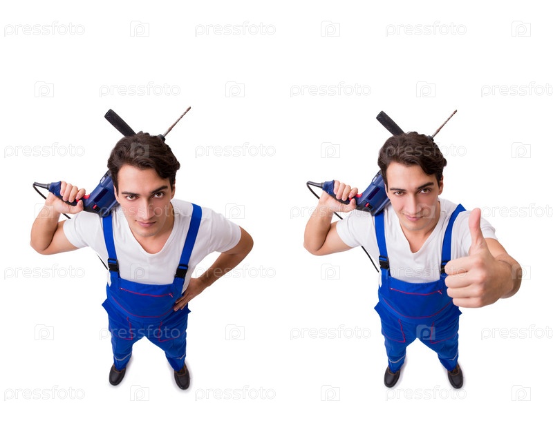 Забавный мастер-ремонтник с дрелем, изолированным на белом