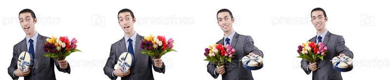 Бизнесмен с коробкой подарков и цветами