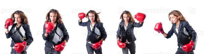 Молодая женщина в боксерских перчатках изолирована на белом