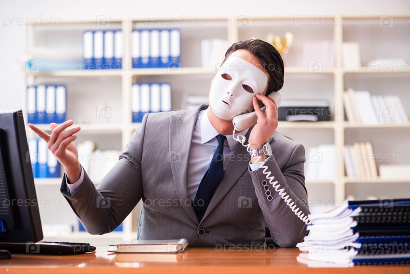Бизнесмен с маской в офисе концепция лицемерия