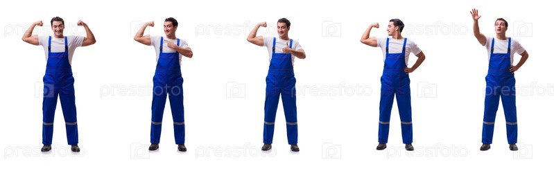 Красивый слесарь, носящий комбинезон изолированный на белом
