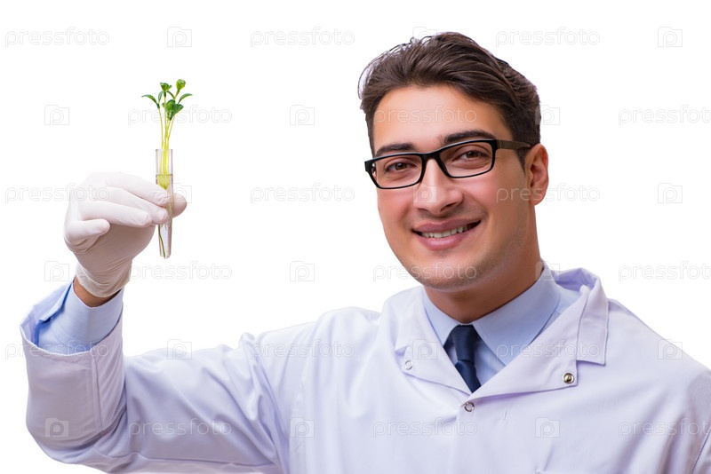 Ученый с зеленым саженцем в стекле, изолированном на белом