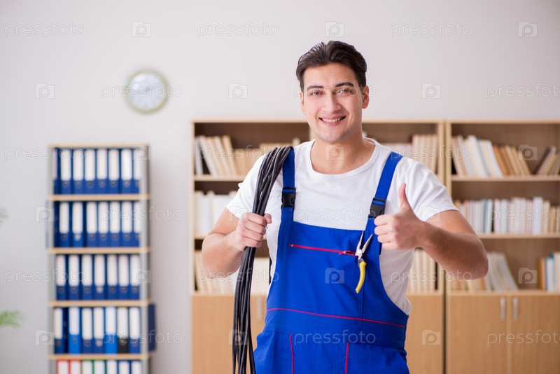 Молодой электрик с кабелем работает в офисе