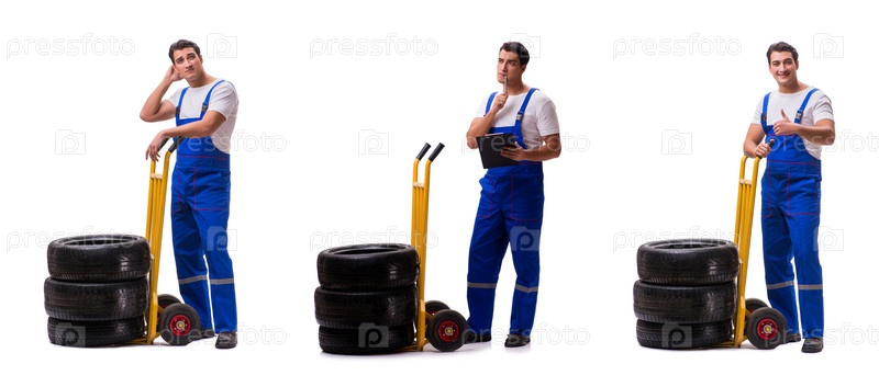 Ремонтник шин с тележкой, изолированной на белом