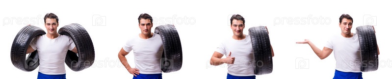 Красивый ремонтник шин изолированный на белом