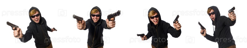 Агрессивный мужчина с пистолетом изолирован на белом