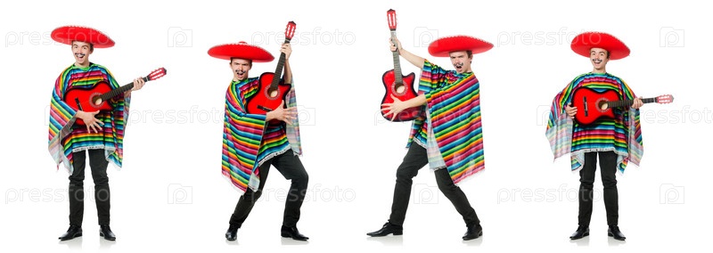 Забавный молодой мексиканец с гитарой изолирован на белом