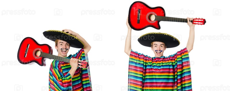 Забавный молодой мексиканец с гитарой изолирован на белом