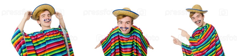 Забавный молодой мексиканец с фальшивыми усами, изолированный на белом