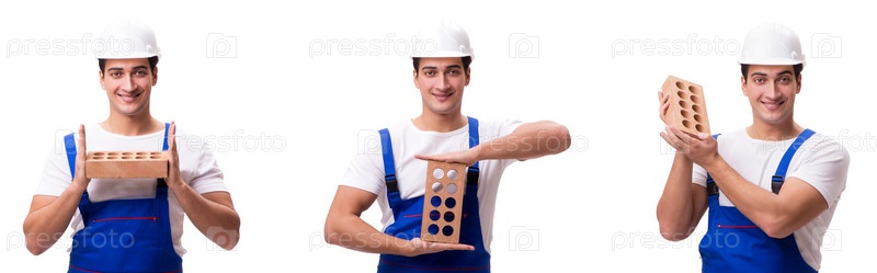 Человек с кирпичом, изолированный на белом