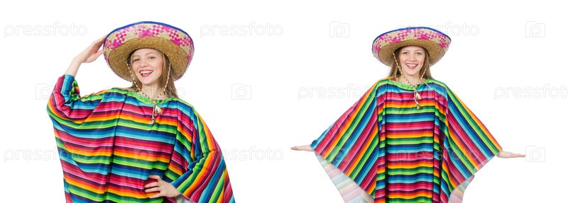 Красивая девушка в мексиканском пончо изолирована на белом