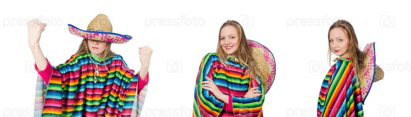 Красивая девушка в мексиканском пончо изолирована на белом
