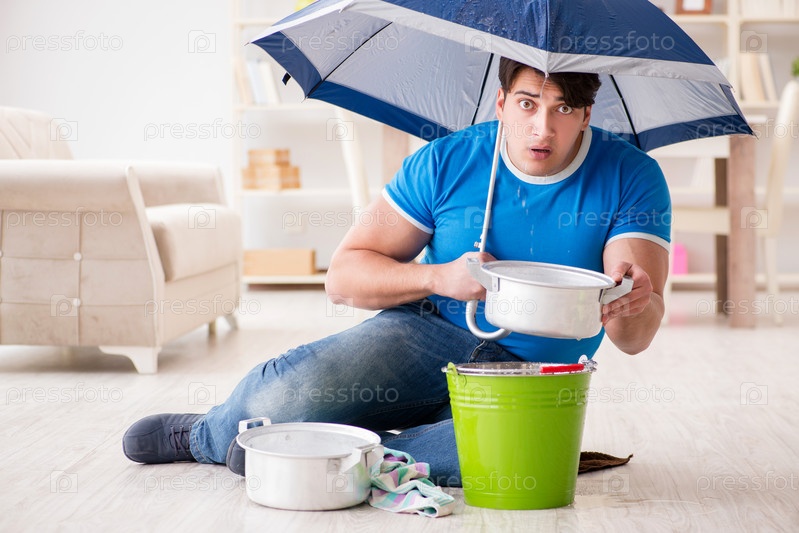 Мужчина дома, имеющий дело с соседней утечкой воды