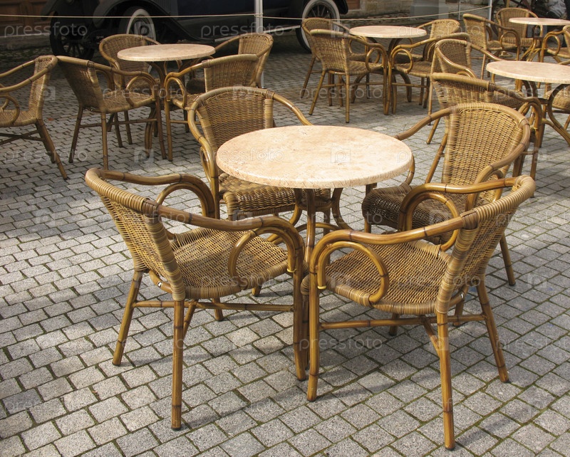 Уличное кафе. Столы и плетеные стулья