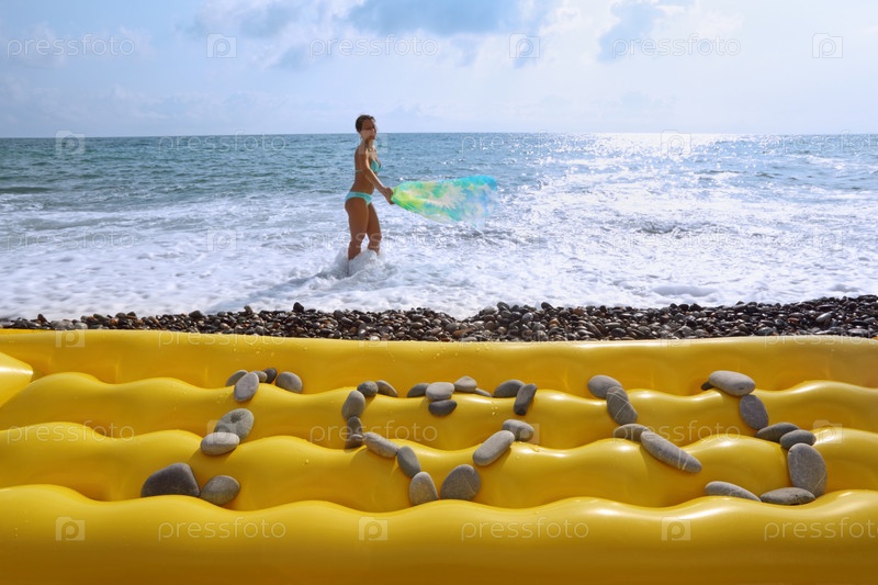 Молодая женщина на берегу моря и надпись из камней выложена на желтом матрасе