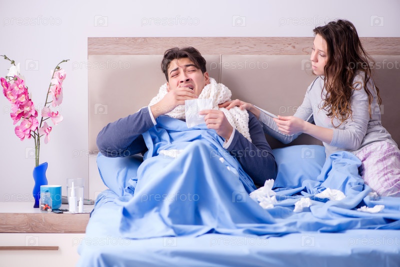 Жена ухаживает за больным мужем дома в постели