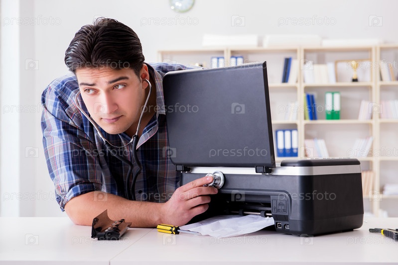 Ремонтник, ремонтирующий сломанный цветной принтер