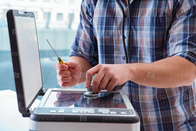 Ремонтник, ремонтирующий сломанный цветной принтер