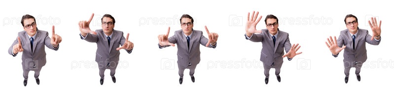 Забавный бизнесмен нажимает виртуальные кнопки, изолированные на белом
