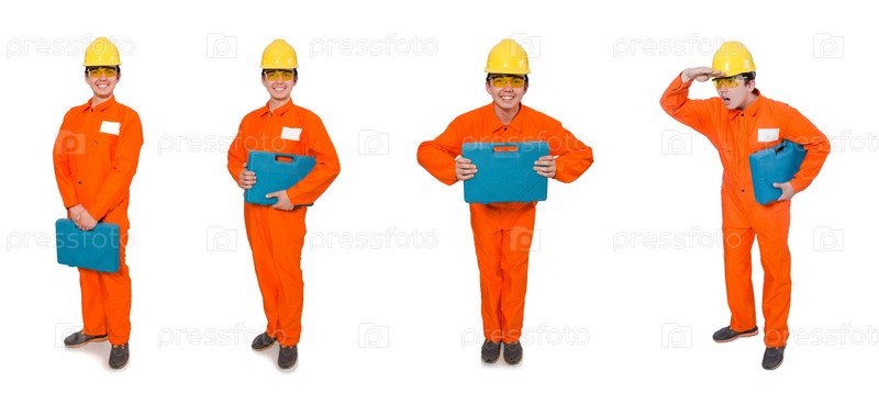 Мужчина в оранжевых комбинезонах изолирован на белом