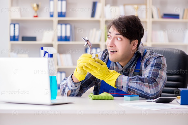 Уборщик, работающий в офисе Мужчина
