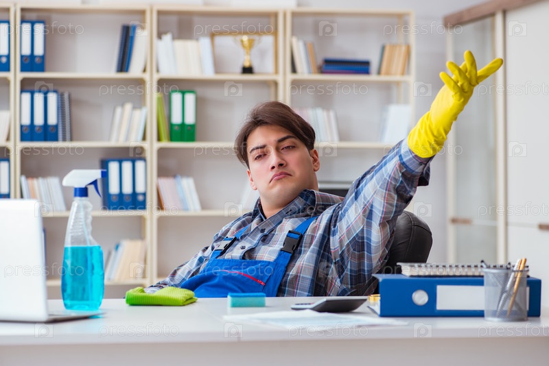 Уборщик, работающий в офисе Мужчина