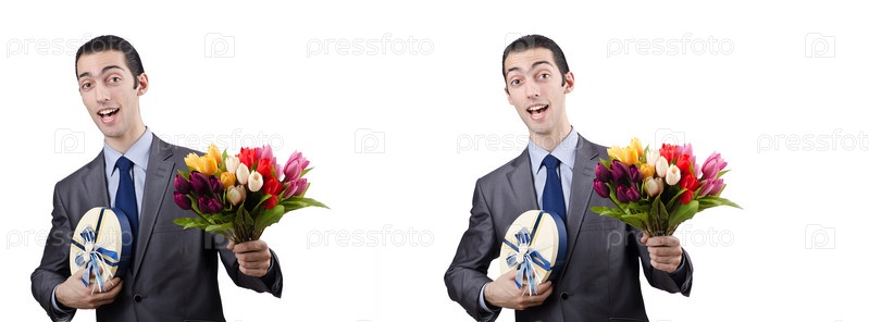Бизнесмен с коробкой подарков и цветами