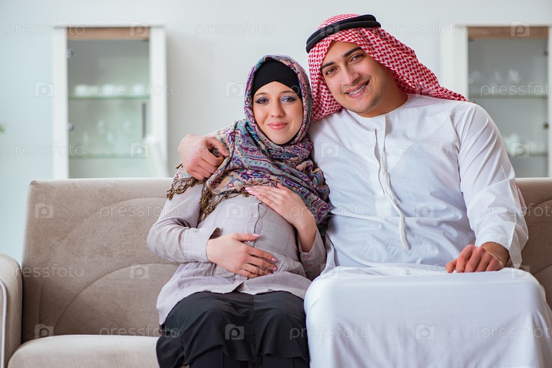 Молодая арабская мусульманская семья с беременной женой, ожидающей ребенка
