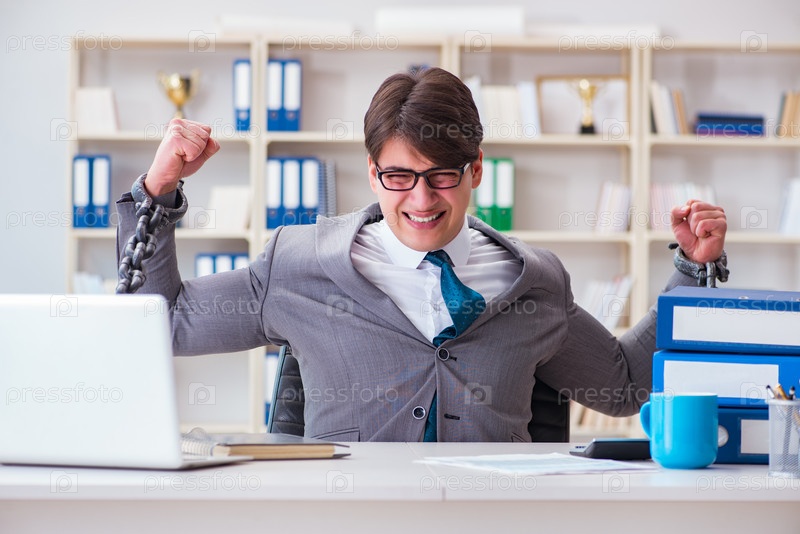 Бизнесмен связан цепями к своей работе