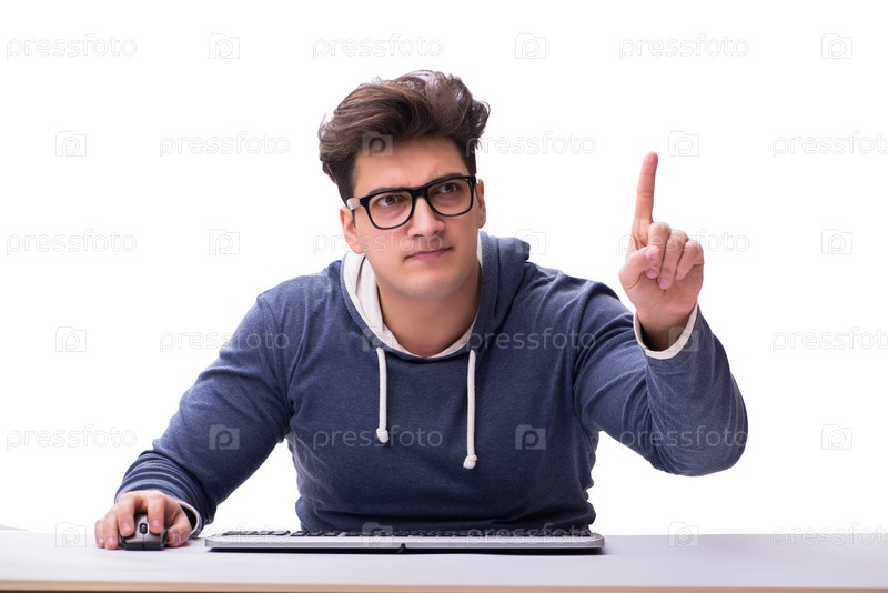 Забавный ботаник работает на компьютере, изолированный от белого