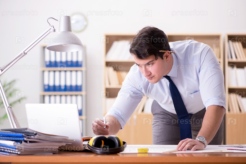 Инженер-начальник работает над чертежами в офисе