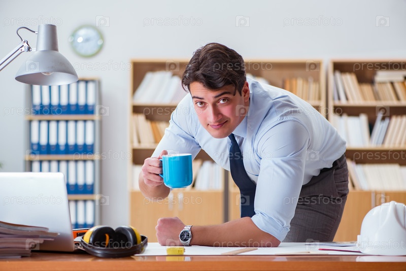 Инженер-начальник работает над чертежами в офисе