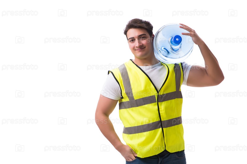 Мужчина доставляет бутылку с водой, изолированную на белом