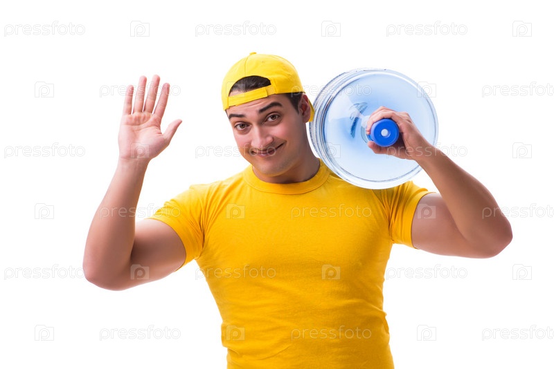 Мужчина доставляет бутылку с водой, изолированную на белом