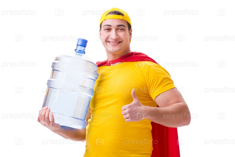 Мужчина доставляет бутылку с водой, изолированную на белом
