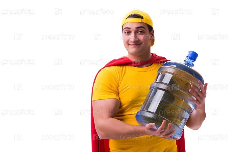 Мужчина доставляет бутылку с водой, изолированную на белом