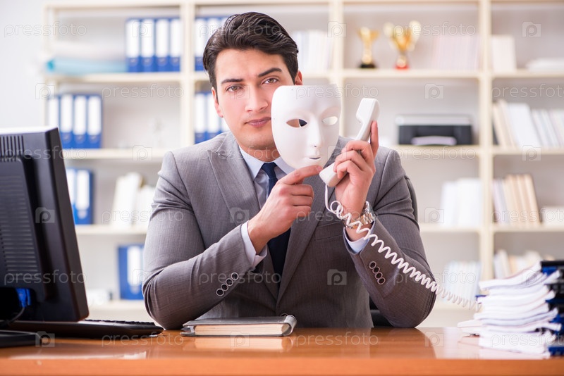 Бизнесмен с маской в офисе концепция лицемерия