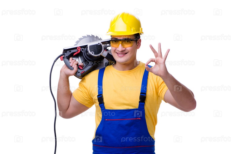 Плотник в комбинезонах с круговой пилой, изолированной на белом