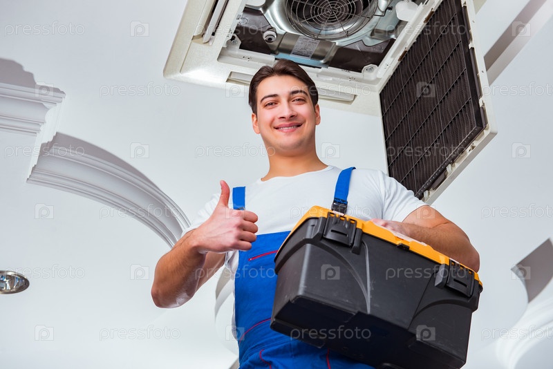 Работник, ремонтирующий потолок кондиционера