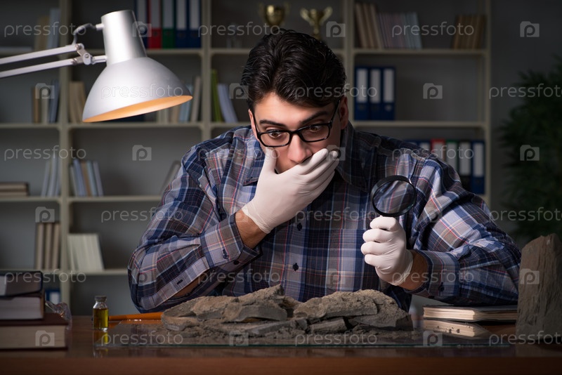 Археолог, работающий поздно ночью в офисе