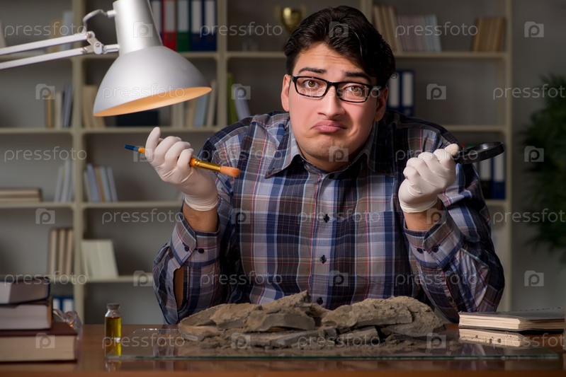 Археолог, работающий поздно ночью в офисе