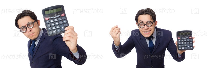 Забавный человек с калькулятором изолирован на белом