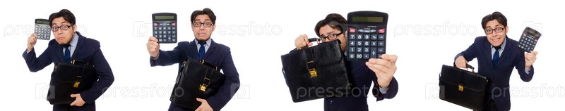 Забавный человек с калькулятором изолирован на белом