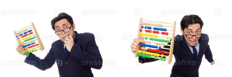 Забавный бизнесмен с абаком, изолированным на белом