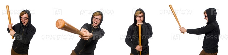 Агрессивный мужчина с бейсбольной битой, изолированной на белом