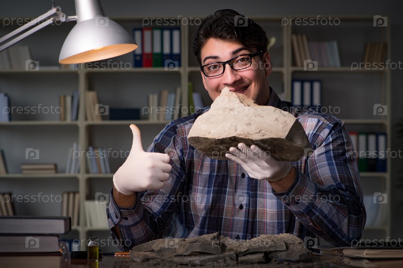 Археолог, работающий поздно ночью в офисе