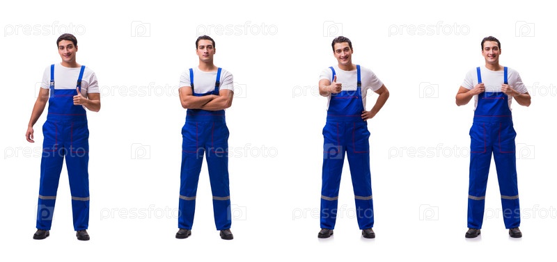 Красивый слесарь, носящий синие комбинезоны на белом