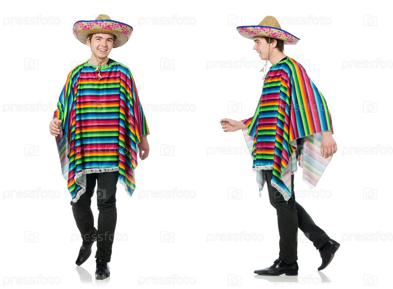 Забавный молодой мексиканец с фальшивыми усами, изолированный на белом