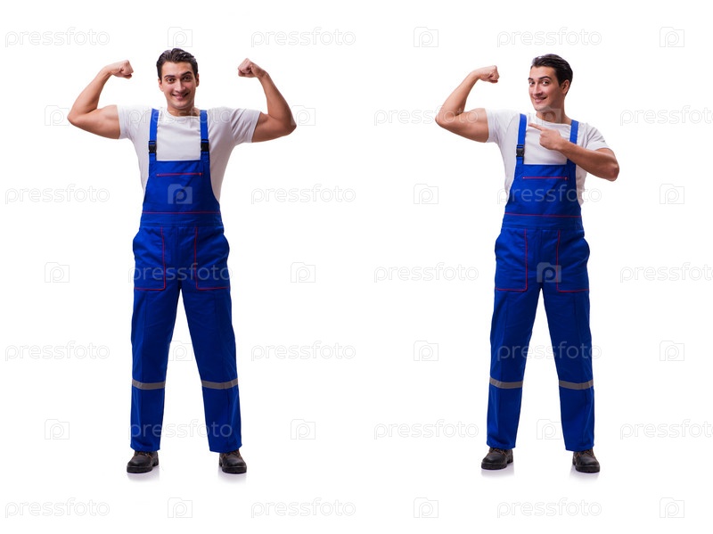 Красивый слесарь, носящий комбинезон изолированный на белом