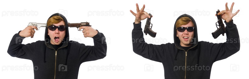 Агрессивный мужчина с пистолетом изолирован на белом